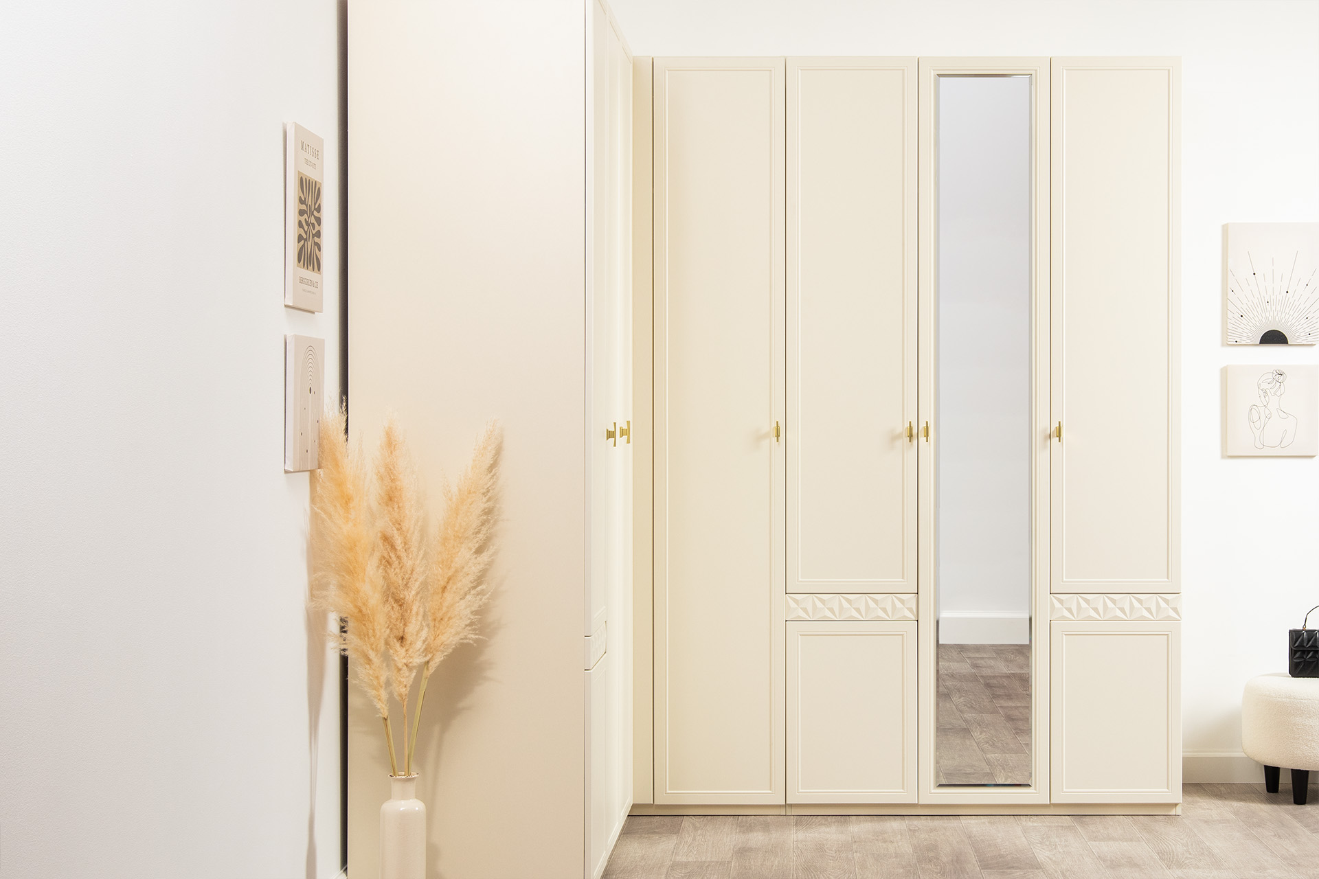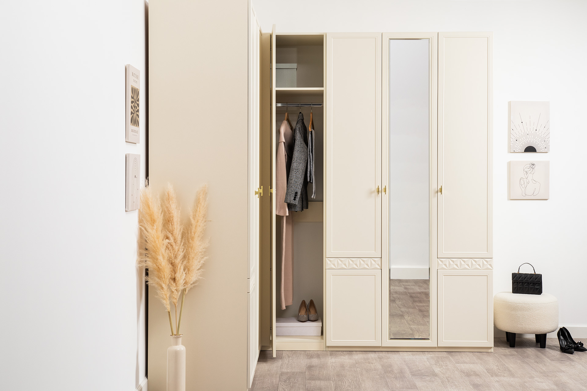 Изящные линии, глубокая фрезеровка фасадов из МДФ и благородные оттенки. Утончённая «Слоновая кость» и изысканная «Олива Шагрень» с глубоким зелёным тоном — создают атмосферу уюта, тепла и благородства. Металлические ручки и опоры золотого цвета придают мебели утончённый блеск, а петли и направляющие с доводчиками обеспечивают плавное и бесшумное закрытие фасадов.