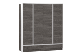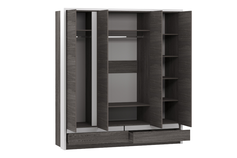Четырехстворчатый шкаф VIRGINIA НМ 011.51 благодаря своей функциональности и вместительности может заменить сразу несколько предметов мебели, сэкономив Ваши средства и площадь. Шкаф имеет 2 секции с выдвижными штангами, что максимально увеличивает объем хранения одежды и позволяет рассортировать вещи по необходимым характеристикам: взрослая и детская; зимняя и летняя и т.д. Для размещения повседневной одежды лучше всего подойдет отдел с полками, а два выдвижных ящика помогут навести порядок в хранении белья и аксессуаров. Белая рамка по периметру и монохромные планки образуют геометрический рисунок, визуально разделяя фасад модуля на секции, за счет чего шкаф не выглядит громоздким.