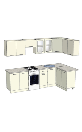 Модули в данном комплекте: 2 по 80 см, 40 см и угловой модуль универсальный (на любую сторону) на 100 см, также над плитой предусмотрен шкаф под вытяжку на 60 см.
