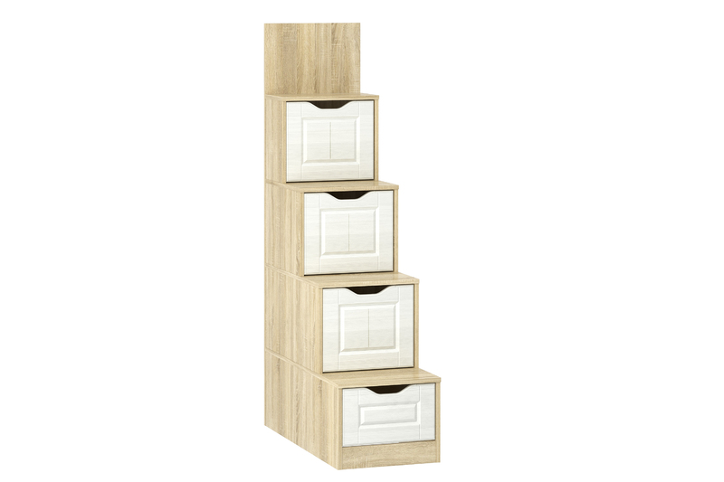 Стеллаж Оливия НМ 011.64 Х используется в качестве лестницы к верхнему спальному месту двухъярусных кроватей из той же коллекции. Модуль оснащен четырьмя закрытыми секциями для хранения игрушек, белья и мелочей. Интегрированные ручки минимизируют риск получения ребенком травмы во время использования модуля. В комплект к стеллажу можно приобрести поручень ОЛИВИЯ НМ 011.64 М, который защитит ребенка от случайного падения.