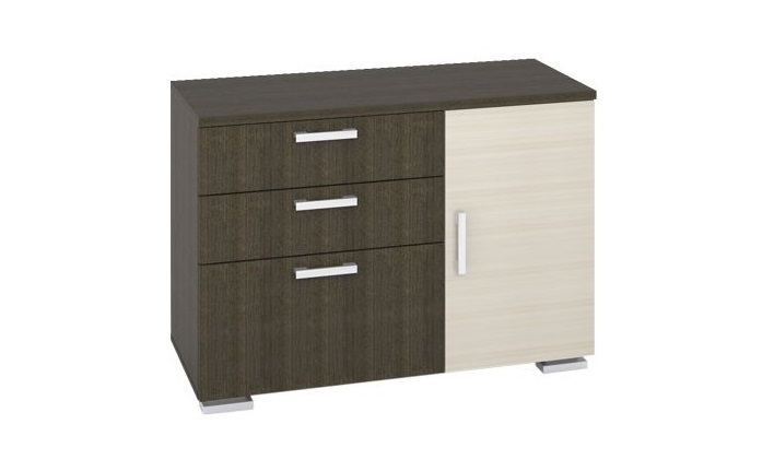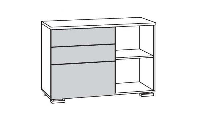 Три выдвижных ящика для хранения на роликовых направляющих, два верхних ящика для хранения менее глубокие, нижний ящик для хранения большей глубины чем верхние, за распашным фасадом отделение для хранения разделено горизонтальной полкой на две части, пластиковые ручки, пластиковые опоры.