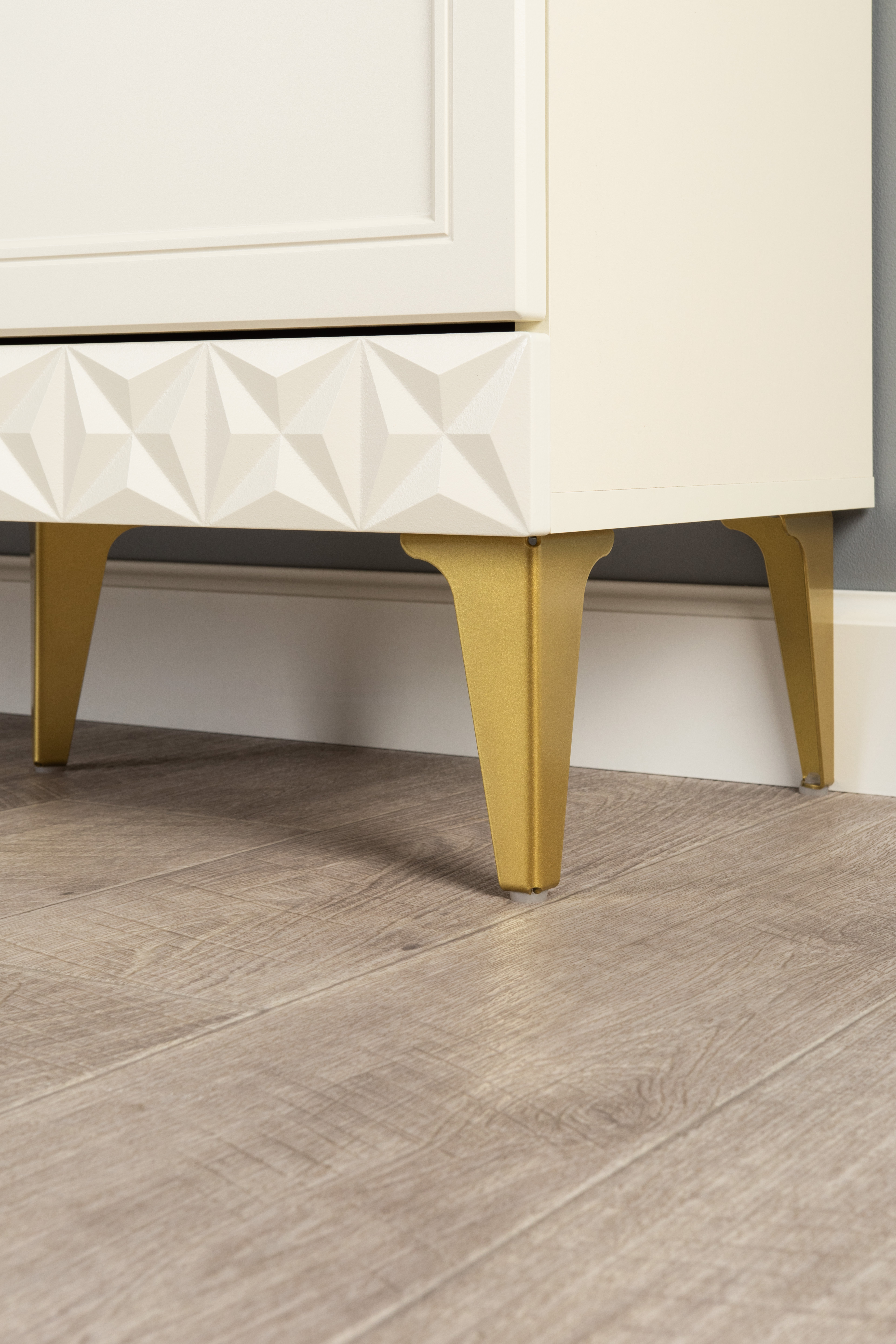 Изящные линии, глубокая фрезеровка фасадов из МДФ и благородные оттенки. Утончённая «Слоновая кость» и изысканная «Олива Шагрень» с глубоким зелёным тоном — создают атмосферу уюта, тепла и благородства. Металлические ручки и опоры золотого цвета придают мебели утончённый блеск, а петли и направляющие с доводчиками обеспечивают плавное и бесшумное закрытие фасадов.