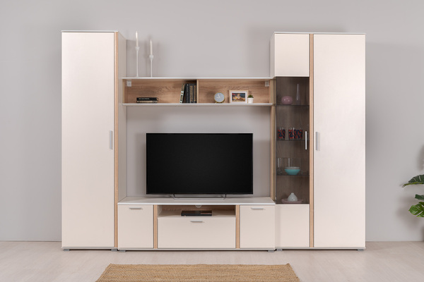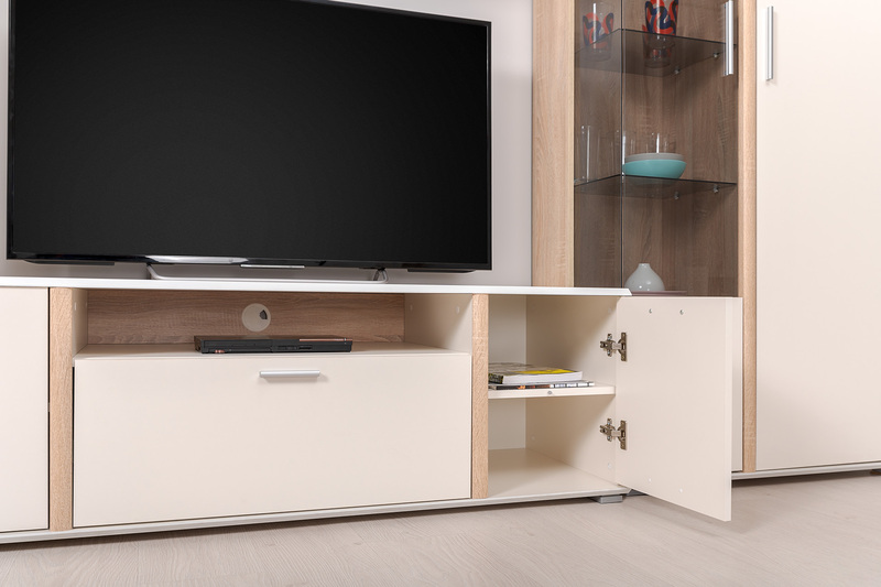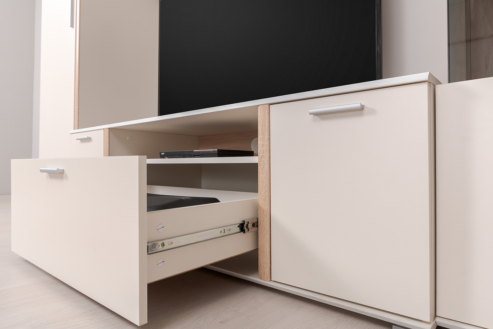 Тумба под ТВ в гостиную Лина 03.282 миндаль, дуб сонома