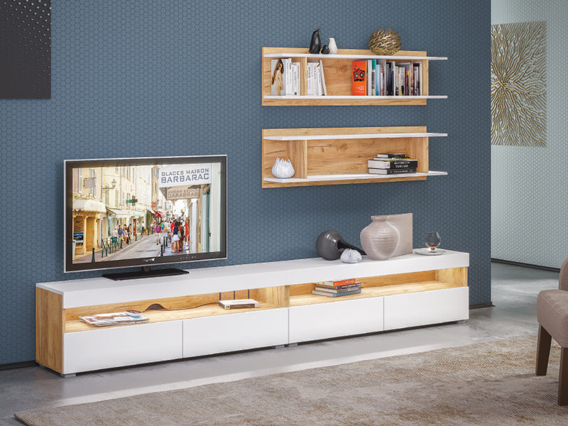 Тумба под ТВ в гостиную Альба дуб золотой CRAFT, белый премиум, с подсветкой