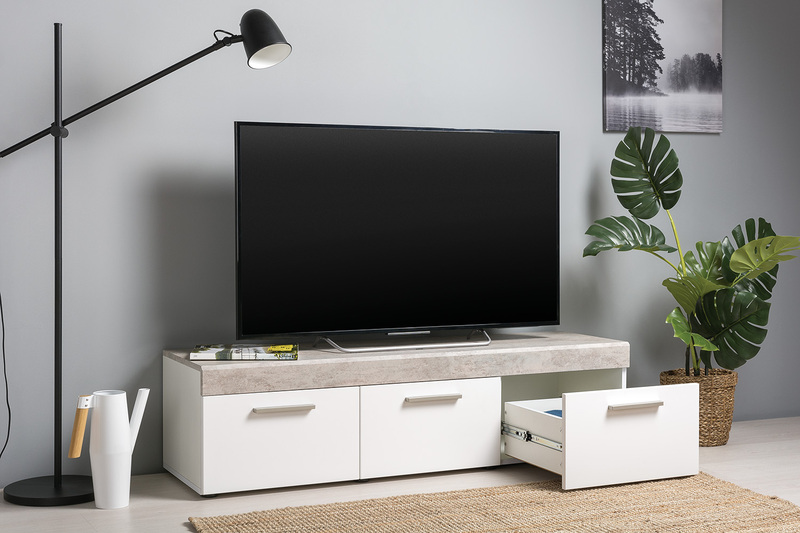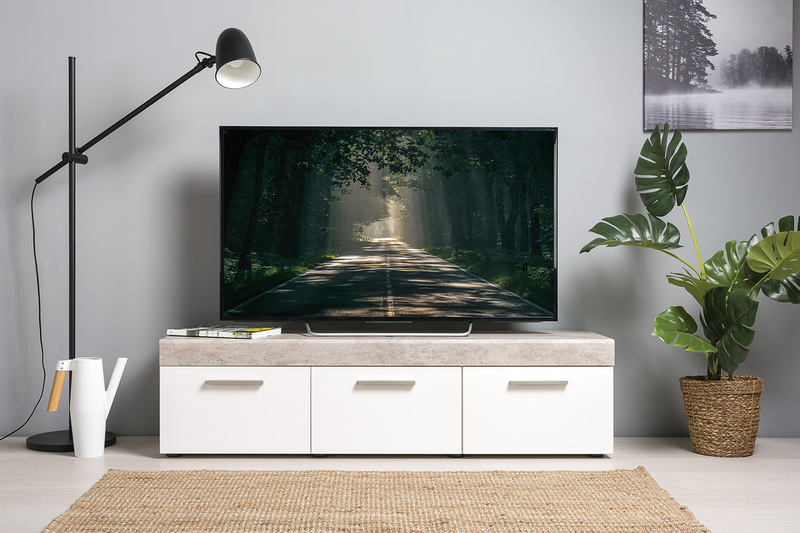 Тумба под ТВ в гостиную Петра 13.281 белый PE шагрень, милк софт ПВХ, бетон чикаго беж ПВХ