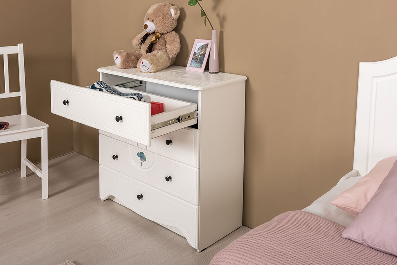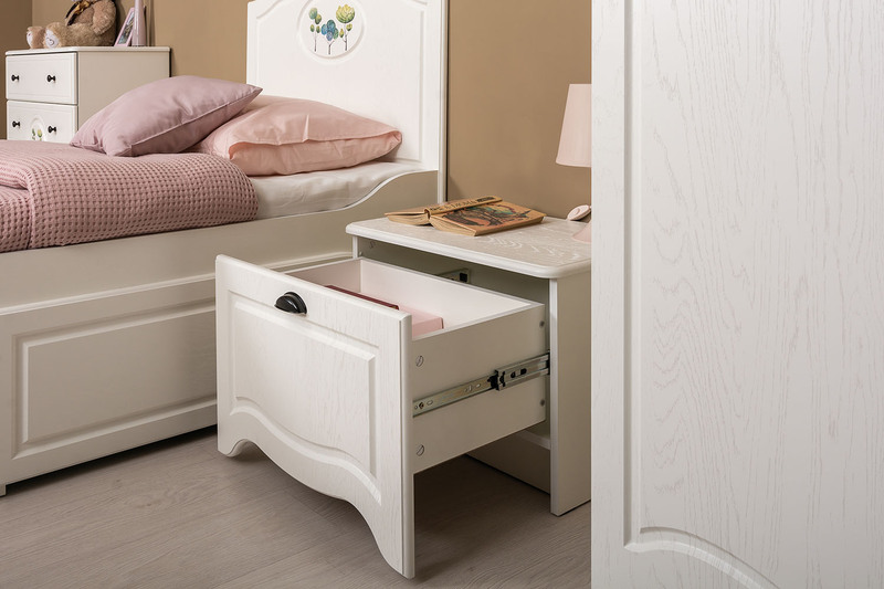 В коллекции Роуз 4 элемента с разным функционалом, которые помогут грамотно сформировать пространство детской комнаты: кровать с большим спальным местом и емкими выкатными ящиками будет шикарно смотреться при любой постановке в интерьере; вместительный комод сможет идеально распределить вещи и игрушки; просторный шкаф сохранит в порядке детский гардероб, а лаконичная, но немаловажная тумбочка отлично дополнит